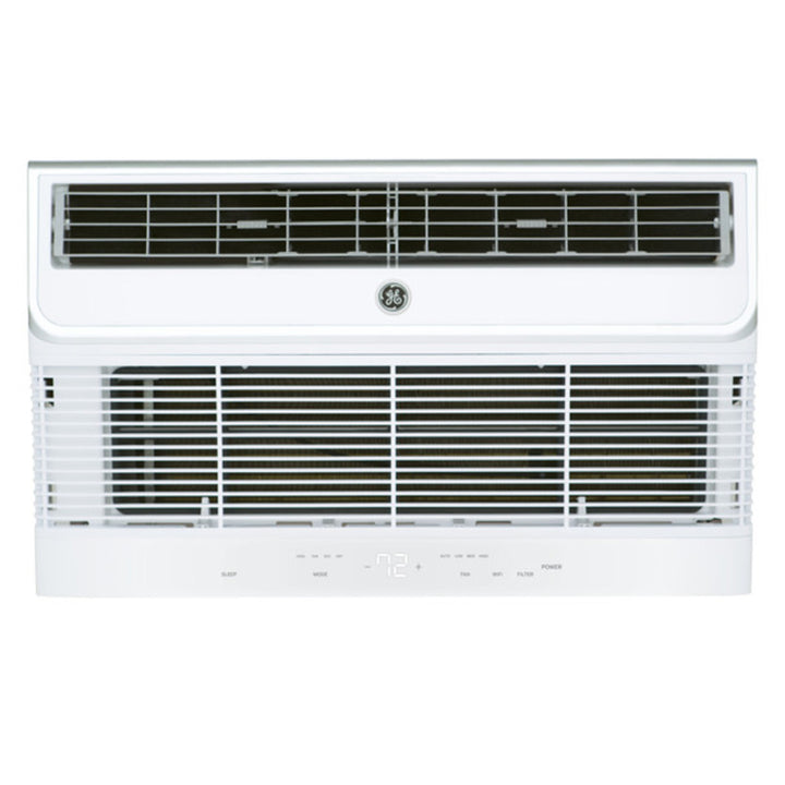 The GE AJCM10DWJ is a 26-inch built-in high mount thru-the-wall smart air conditioner that provides 10,000 BTU of cooling capacity, with a cooling EER of 10.6 for energy-efficient performance. It operates on 230/208V power with R32 refrigerant and supports smart home connectivity through Amazon Alexa and Google Home. The unit features 3 cooling fan speeds and 3 fan-only speeds, delivering airflows of up to 280 CFM. Additional features include a 6-way adjustable louver style, smart fan switch, energy saver mode, and filter reminder function. The rigid, washable filter ensures continuous air quality, while the rotary compressor guarantees reliable cooling. The unit is equipped with a 68-inch power cord, tandem/right-angle LCDI plug, and an electronic digital thermostat for precision control. It includes a remote control, is designed for wall mounting, and is WiFi-connected for added convenience. The unit's net weight is 77.2 lbs, and its overall dimensions are 22" depth, 16" height, and 26" width.